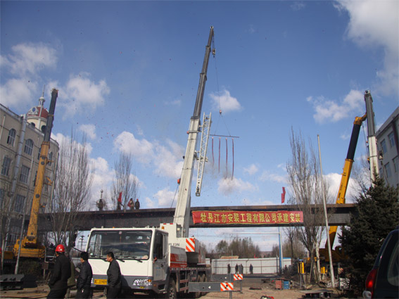 由我公司施工的牡丹江市興中路人行天橋工程,于2010.10.26上午10時,將總重量為80噸的鋼梁整體一次吊裝就位。