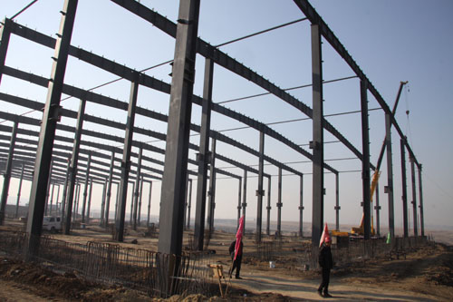經(jīng)過60天的緊張施工,光伏園區(qū)8號(hào)標(biāo)準(zhǔn)化廠房,鋼結(jié)構(gòu)安裝實(shí)現(xiàn)主體封閉。2011年11月8日